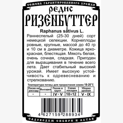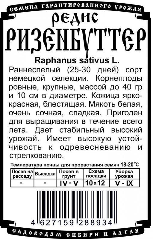 Раннеспелый (25-30 дней) сорт немецкой селекции. Корнеплоды ровные, крупные, массой до 40 гр и 10 см в диаметре. Кожица ярко-красная, блестящая. Мякоть белая, очень сочная, сладкая. Пригоден для выращивания в течение всего лета. Дает стабильный высокий урожай. Имеет высокую устойчивость к одревесневанию и стрелкованию.