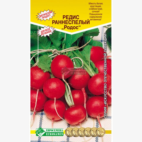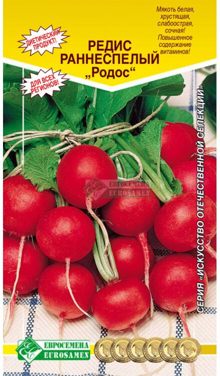 Раннеспелый, высокоурожайный гибрид редиса для выращивания в открытом и закрытом грунте. Период от полных всходов до начала технической спелости 19-28 дней. Корнеплоды округлые, красные, в верхней части ярко-красные, массой 15-25 г, очень выровненные с дружной отдачей урожая. Мякоть белая, сочная, хорошего вкуса. Вкусовые качества хорошие. Допускается посев в разные сроки, начиная с ранней весны. Редис повышает аппетит, улучшает пищеварение, регулирует сердечный ритм, повышает иммунитет. Сок редиса рекомендуют при кашле.