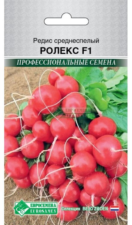 Ранней весной особенно сильно нас тянет к свежей зелени и овощам, но не к тепличным, а выращенным на своих огородах. Редис — один из первых весенних плодов, как радостный привет из наступающего лета, который появляется в нашем меню после долгой зимы, поэтому он является очень актуальным в начале весеннего периода. Только на первый взгляд редис кажется простым, на самом деле он обладает внушительным перечнем полезных свойств. Этот сочный, приятный на вид корнеплод со сладковатой остротой насыщает организм витаминно-минеральным комплексом, богат клетчаткой. Ролекс- среднеспелый (25-30 дней от всходов до технической спелости) высокоурожайный гибрид. Рекомендуется для выращивания в открытом и защищенном грунте. Корнеплод округлый, ярко-красного цвета, гладкий, массой 25-30 грамм. Мякоть белая, нежная, сочная, слабо острая. Гибрид устойчив к цветушности, рекомендуется для массового сбора редиса пучками.