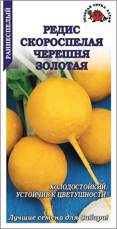 Сорт раннеспелый, холодостойкий, устойчив к цветушности. От массовых всходов до начала хозяйственной годности 22-24 дня. Корнеплоды желтые, округлой формы, гладкие, массой 15-20 г. Мякоть белая, очень нежная, сочная, без горечи, долго не дрябнет. В качестве ранней зелени в салаты можно употреблять листья редиса.