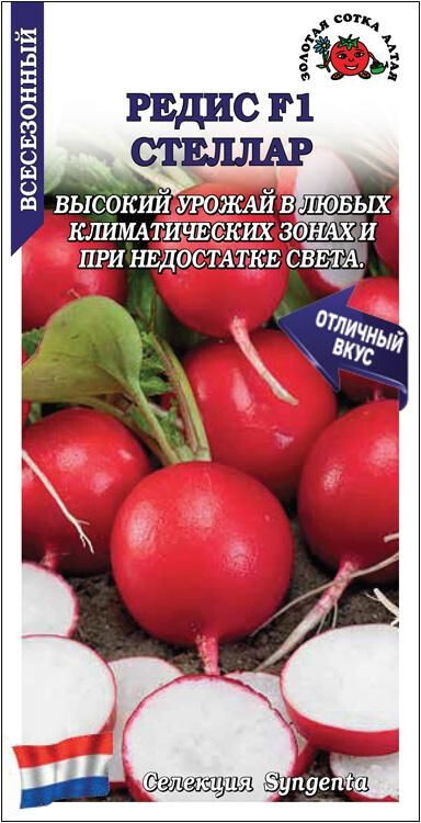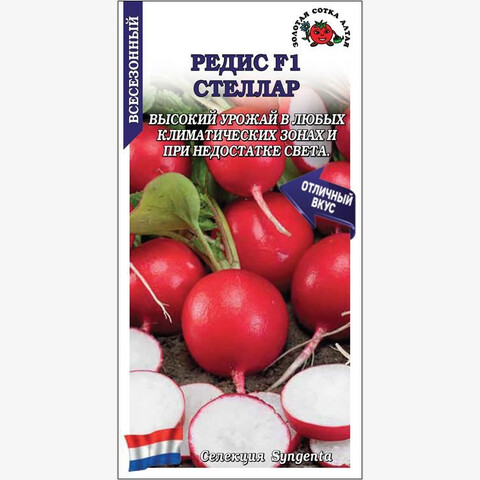 Отличный среднеспелый сорт для возделывания в любых почвенно-климатических условиях, устойчив к цветушности, пониженным температурам и недостаточной освещенности. От всходов до уборки 23-25 дней. Розетка листьев полупрямостоячая. Корнеплоды округлые, массой 30-35 г, красные, окрашены равномерно. Мякоть белая, плотная, нежная и сочная, отличного вкуса. Корнеплоды длительное время после уборки сохраняют вкусовые и товарные качества.