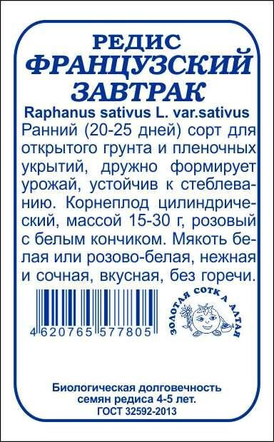 Сорт раннеспелый, прекрасно растет как в открытом грунте, так и под пленкой. От массовых всходов до начала сбора урожая 20-25 дней. Корнеплоды розовые с белым кончиком, цилиндрические, массой 15-30 г. Мякоть белая или розово-белая, нежная, сочная, отличного вкуса, не горчит. Сорт устойчив к стеблеванию.