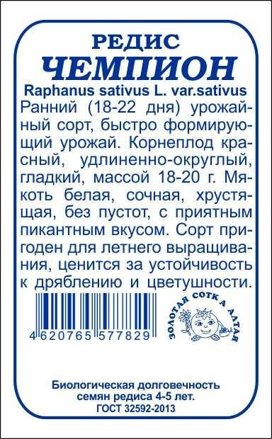 Раннеспелый урожайный сорт, быстро формирующий корнеплоды. Срок созревания 18-22 дня. Розетка листьев полуприподнятая. Корнеплод красный, удлиненно-округлый, гладкий, массой 18-20 г. Мякоть белая, сочная, хрустящая, без пустот, с приятным пикантным вкусом. Сорт пригоден для летнего выращивания, ценится за хорошие вкусовые качества, устойчив к дряблению и цветушности.