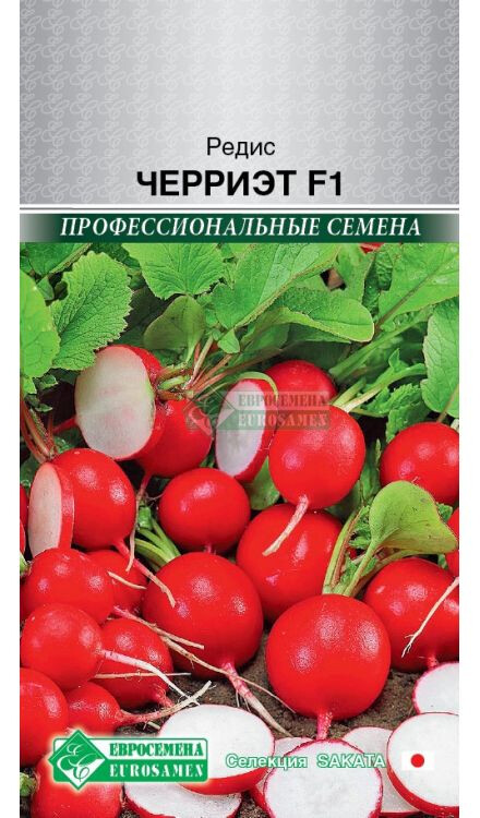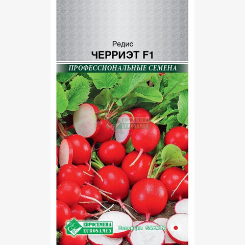 Ранней весной особенно сильно нас тянет к свежей зелени и овощам, но не к тепличным, а выращенным на своих огородах. Редис — один из первых весенних плодов, как радостный привет из наступающего лета, который появляется в нашем меню после долгой зимы, поэтому он является очень актуальным в начале весеннего периода. Только на первый взгляд редис кажется простым, на самом деле он обладает внушительным перечнем полезных свойств. Этот сочный, приятный на вид корнеплод со сладковатой остротой насыщает организм витаминно-минеральным комплексом, богат клетчаткой. Черриэт- среднепоздний гибрид редиса для выращивания в открытом и закрытом грунтах. Лист серовато-зелёный. Корнеплод ровной круглой формы ярко-красного цвета с коротким кончиком. Мякоть белая, нежная, сочная, средней остроты. Средняя масса корнеплода 25-30 грамм. Сохраняет отличные вкусовые качества даже при перерастании. Устойчив к стрелкованию. Рекомендуется для круглогодичного выращивания.