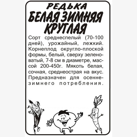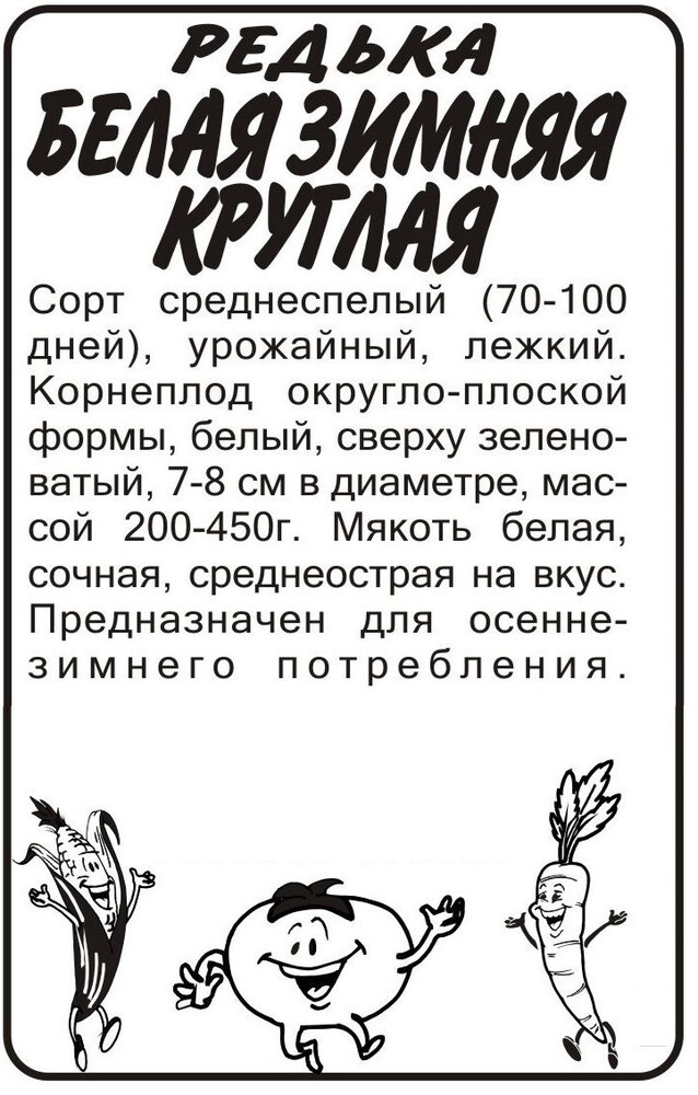 Среднеспелый сорт (поспевает на 100-110-й день после посева), предназначен для потребления в свежем виде и для хранения. Корнеплод белый, у головки зеленоватый, круглый, мякоть белая, сочная, приятного слабоострого вкуса. Место посадки: рыхлые плодородные легкие почвы с нейтральной реакцией среды. Может расти на тяжелых почвах. Освещение: требователен к свету, в тени дает длинную ботву и маленький корнеплод Предпосевная подготовка: не требуется Сроки посева: среднеспелую редьку высевают с середины июня, после начала сокращения светового дня Посев на рассаду: не предусмотрено Посев в грунт: сеют в борозды, семена раскладывают на увлажненный грунт, присыпают землей, хорошо уплотняют, обильно поливают водой. Глубина заделки 2-3 см. Схема посадки 25х25 см. Посевы рекомендовано накрывать укрывным материалом до появления всходов Пикировка/перевалка: не предусмотрена Уход: при проявлении первого настоящего листа всходы прореживают, оставляя расстояние 15 см между растениями. Не допускать загущенности посевов, пересыхания и уплотнения почвы, так как это может вызвать стрелкование растения. Необходим своевременный полив, особенно во время формирования корнеплодов. Использование свежих органических удобрений под редьку не рекомендуется, так как они вызывают дуплистость и загнивание корнеплода