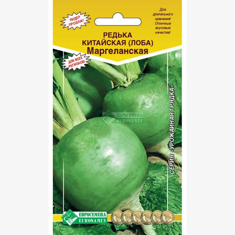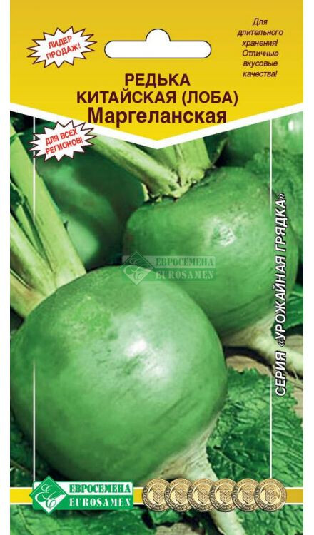 Редька не может похвастаться большим количеством витаминов, однако витаминный состав этого овоща идеально сбалансирован. Как диетический продукт редька весьма эффективна. Несмотря на малое количество калорий (35 ккал на 100 г), редька вызывает чувство сытости. Когда клетчатка попадает в желудочно-кишечный тракт, она разбухает. Целебные же свойства редьки были известны еще в античные времена. Современные исследования только подтвердили то, что древние врачи и народные целители знали и так. Она обладает противовоспалительными свойствами, помогает при лечении многих болезней. Маргеланская- среднеспелый сорт для выращивания в открытом грунте и для потребления в свежем виде. Период от полных всходов до технической спелости 60-65 дней. Корнеплоды эллиптической формы зеленого цвета, головка округлая. Мякоть белая, плотная, сочная, остро-сладкого вкуса. Масса товарного плода 250-300 г. Вкусовые качества и лежкость отличные.