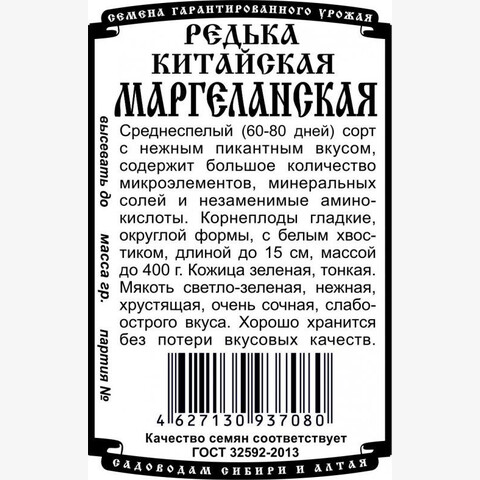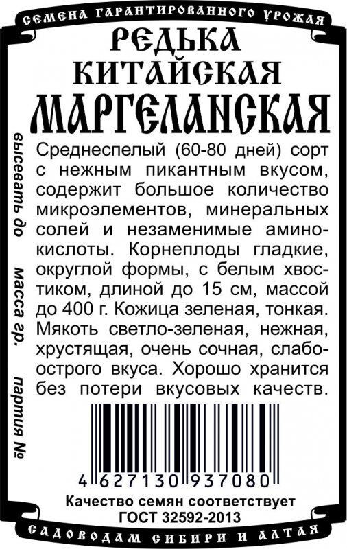 Среднеспелый (60-80 дней) сорт с нежным пикантным вкусом, содержит большое количество микроэлементов, минеральных солей и незаменимые аминокислоты. Корнеплоды гладкие, округлой формы, с белым хвостиком, длиной до 15см, масса до 400г. Кожица зеленая, тонкая. Мякоть светло-зеленая, нежная, хрустящая, очень сочная, слабо-острого вкуса. Хорошо хранится без потери вкусовых качеств.