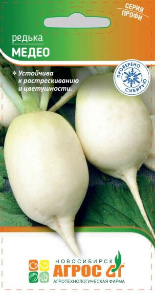Среднеспелый сорт редьки. Розетка прямостоячая, полуприподнятая. Корнеплоды крупные, белой и светло-зеленой окраски, овальной формы в диаметре до 7 см, массой 250-300 г. Мякоть сочная, белая или чуть зеленоватого оттенка, без горечи. Сорт устойчив к растрескиванию и цветушности. Ценность сорта: высокая урожайность, отличное качество и вкус корнеплодов. Рекомендуется для использования в свежем виде. Особенности выращивания: глубина заделки семян 2-3 см. У выкопанных корнеплодов листья обрезают, не повреждая верхушечных почек. Оригинатор: ООО "НПО "ГАВРИШ" - - VII - 10x20 IX
