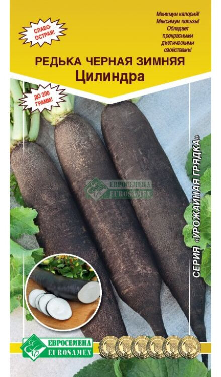 Целебные свойства редьки были известны еще в античные времена. Современные исследования только подтвердили то, что древние врачи и народные целители знали и так. Она обладает противовоспалительными свойствами, помогает при лечении многих болезней. Часто внутрь ее употребляют в виде сока, она незаменимое дополнение в рацион в сезон простуды. Цилиндра- среднеспелый сорт (период от полных всходов до начала технической спелости 62-73 дня) с прекрасными диетическими и вкусовыми качествами. Плоды черные, цилиндрические, массой 170-210 грамм, с белой сочной мякотью приятного слабо острого вкуса. Урожайность в пределах 2-4 кг/м2, отличается устойчивостью к цветушности, низким температурам и слабой освещенности, имеет хорошую лежкость в период зимнего хранения.
