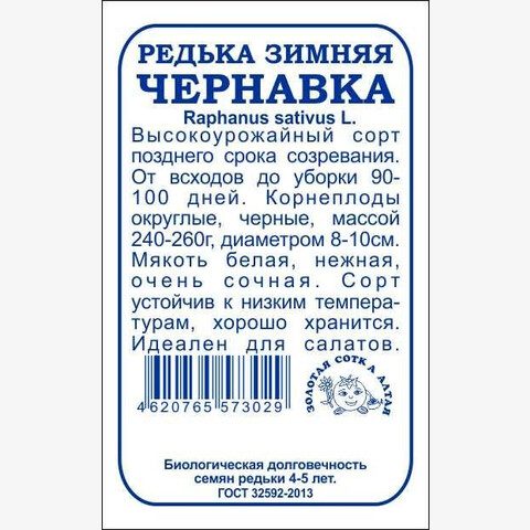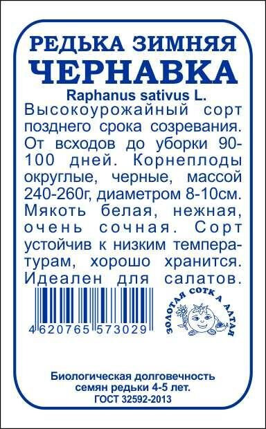 Высокоурожайный сорт с отличной лежкостью и транспортабельностью, устойчивостью к низким температурами засухе. От всходов до хозяйственной годности 105-110 дней. Корнеплоды округлые, диаметром 8-10 см и массой 240-260 г, черные, шероховатые, погружены в почву на 1/8 длины, выдергиваются легко. Мякоть белая, нежная и очень сочная, слабоострого вкуса.