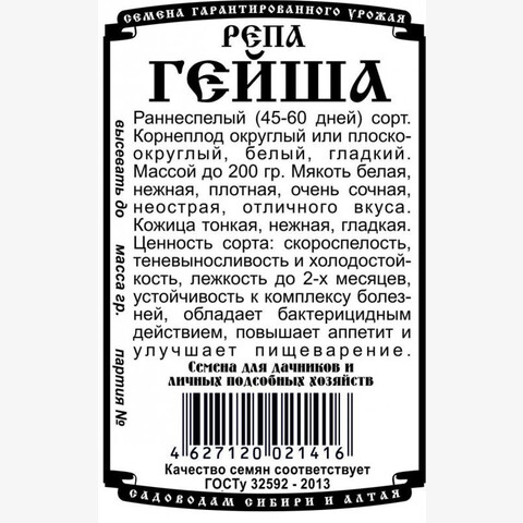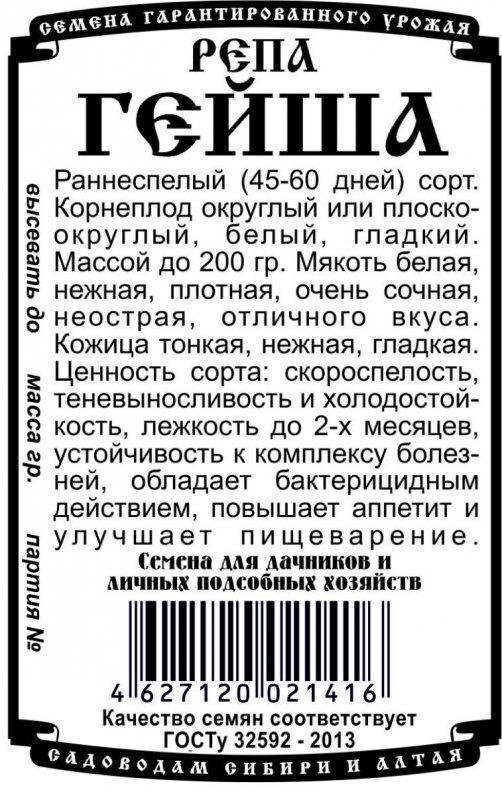 Раннеспелый (45-60 дней) сорт. Корнеплод округлый или плоско - округлый, белый, гладкий. Мякоть белая, нежная, плотная, очень сочная, неострая, отличного вкуса. Кожица тонкая, нежная, гладкая. Macса до 200 гр. Ценность сорта: скороспелость, теневыносливость и холодостойкость, лежкость до 2-х месяцев, устойчивость к комплексу болезней, обладает бактерицидным действием, повышает аппетит и улучшает пищеварение.