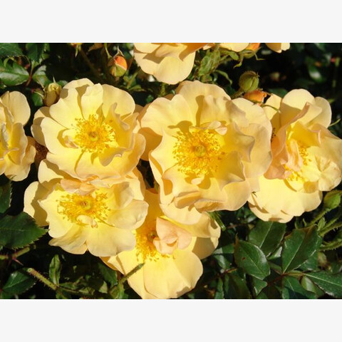 Амбер Сан представляет собой компактный куст, вырастающий в высоту до 50-60 см. Характеризуется растение прямостоячими сильными побегами, обильной загущенностью некрупными темно-зелеными листьями с выраженным глянцем, а также развитой корневой системой. Стебли куста содержат мало удлиненных шипов, что облегчает процесс ухода и срезки цветов. В процессе вегетации куст сильно разрастается в ширину, достигая диаметра в 50-60 см. На каждом стебле формируются соцветия с 5-8 цветками.