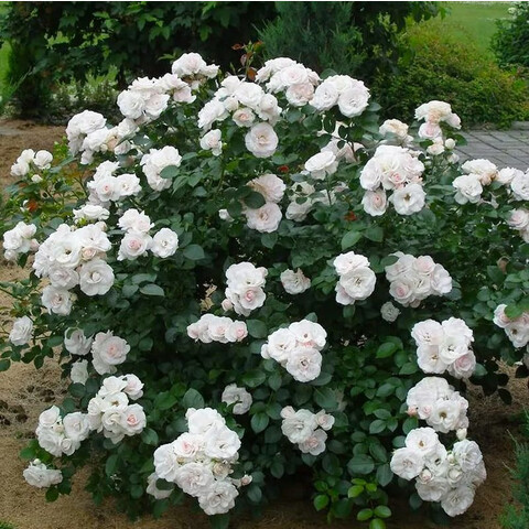 Роза Аспирин подходит для всех посадок – это выразительный и очаровательный цветок. Очень обильно цветущий сорт с крупными, пышными, белыми цветками в солнечную и со светло-розовым оттенком в более прохладную погоду, с хорошими самоочищающимися свойствами. Куст пышный, густой и хорошо покрытый здоровой светло-зеленой листвой, которую иногда даже не видно из-за пышности цветков. Крупные цветы, густая листва делают этот сорт идеальным объектом для использования на террасах, и он отлично смотрится в больших горшках. Высаживается во всем мире и пользуется большой популярностью на протяжении многих лет.