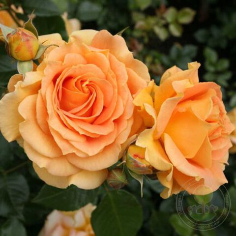 Плотные ярко-оранжевые бутончики сформированы в соцветия (3−5 шт.), а после распускания они становятся махровыми, ностальгическими, переливчатыми золотисто-янтарными цветками средних размеров (6-10 см диаметром). В основной оранжевой окраске цветков зачастую заметны медные нотки. Лепестки немного гофрированные (примерно 25 шт. в бутоне). Цветки источают ненавязчивый и сладкий фруктовый аромат и красиво выделяются на фоне оливково-зеленой глянцевой листвы.