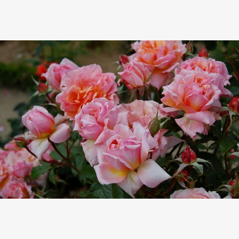 Цветки розово-оранжево-абрикосового цвета, яркие и насыщенные, имеют классическую форму бутона и чашевидную форму цветка. Диаметр цветка составляет от 8 до 10 см, а количество лепестков – около 55. Расположены они в соцветиях по 3-5 штук на стебле.
