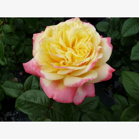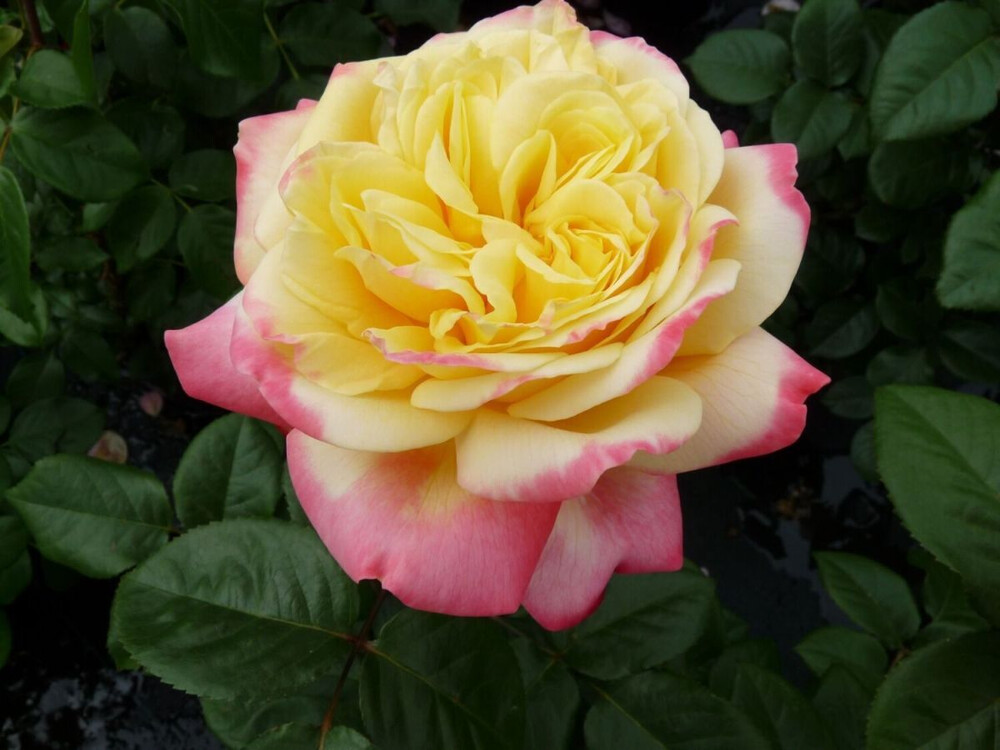 Сорт Кордес Юбилей относится к группе чайно-гибридных роз. Сногсшибательной красотой обладает цветок розы этого сорта. В течение своего существования он меняет свой цвет с желтого до ярко-розового. Сначала, когда бутон только начинает разворачиваться, лепестки желтые, и лишь самые крайние из них имеют ярко-розовую окраску. Чем больше дней цветку, тем больше розовый цвет захватывает каждый лепесток. А желтый и оранжевый цвета отступают к центру. Эффект таков, словно цветок светится изнутри. Фотографии довольно точно передают цвет розы сорта Кордес Юбилей. Цветки крупные, достигают 12 см в диаметре. Сам цветок – супермахровый, в его составе до 50-60 лепестков. Полностью распустившись, он приобретает форму блюдца.