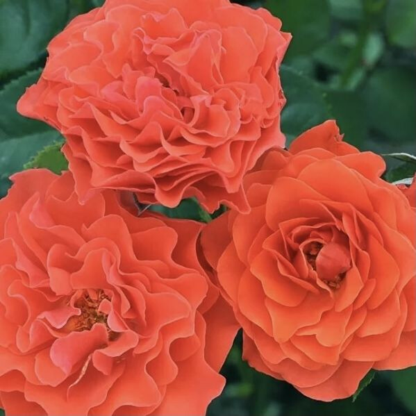 Густомахровые, розетковидные оранжево-коралловые розы диаметром около 6 см расположены на стеблях соцветиями по 5-7 штук. Лепестки нежные, с волнистыми краями, в розетке их 80-100 штук.