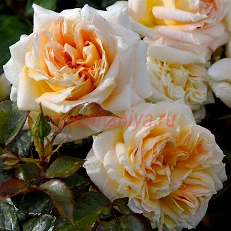 Густомахровые цветы до 100 лепестков в соцветиях по 5-7 шт, оранжево-жёлтого цвета с кремовыми и сливочными оттенками. Аромат нежный. Куст энергично нарастает, глянцевая, яркозелёная листва. Превосходная устойчивость к болезням.