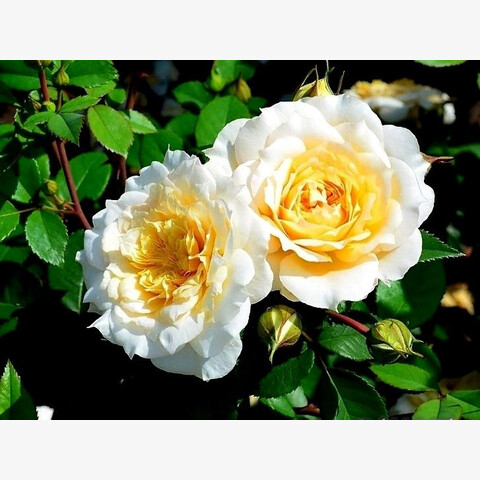 Сорт отличается красивой окраской бутонов – желтым цветом с абрикосовым тоном. Однако при раскрытии цветок становится ванильно-желтым или кремово-белым. Количество лепестков достигает 80-100, что делает цветок густомахровым и очень эффектным.