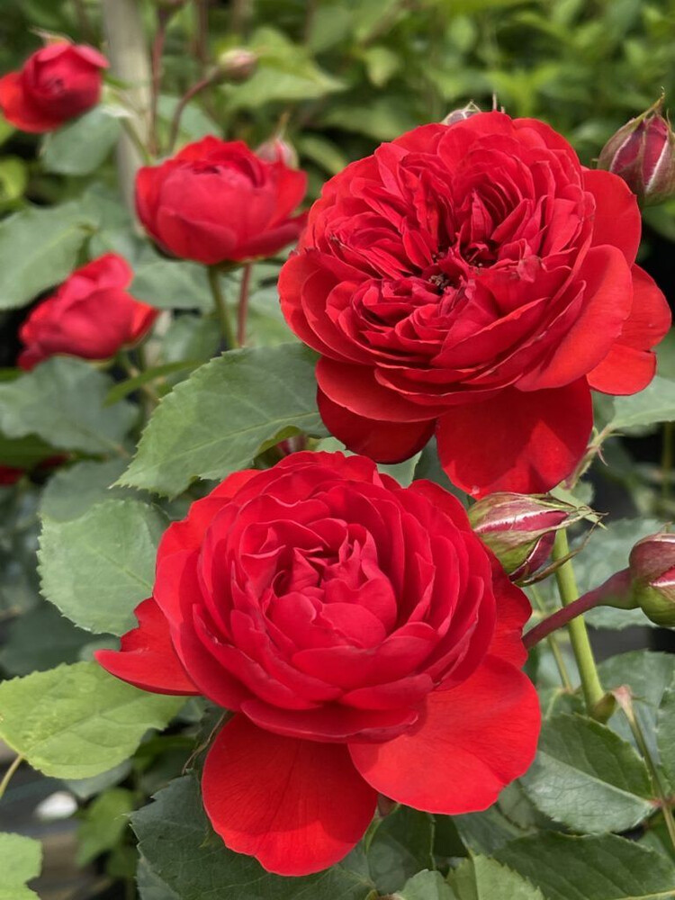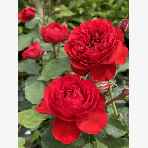 Бутоны бокаловидные, цветки розетковидные, диаметром 10-12 см, густомахровые, число лепестков 80-85, в центре квадратированные. Цветки ярко-красные, растут на ветке по 3-5 шт. В конце августа и осенью лепестки приобретают темные винные оттенки. Аромат нежный, вечером и в жару становится сильнее.