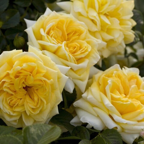 На мощных стеблях можно увидеть от 10 до 12 объёмных густомахровых роз. Они имеют шаровидную форму, диаметр в 10-12 сантиметров и сформированы в соцветия. Бокаловидные бутоны отличаются бледно-жёлтой расцветкой. Раскрываясь, цветок становится солнечно-жёлтым и имеет белоснежную каёмку. Куст источает нежный ненавязчивый аромат.