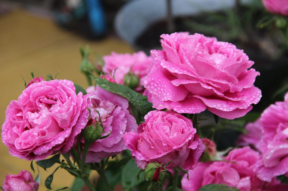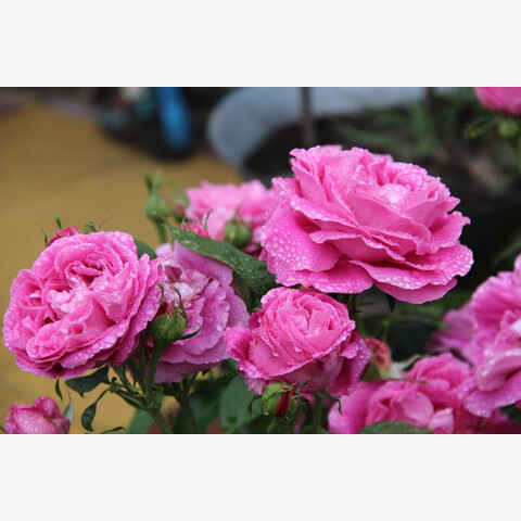 Крупные шаровидные бутоны окрашены в той же цветовой гамме, что и чашевидные квартированные цветки. Размер цветков в полном раскрытии впечатляет — диаметр каждого от 14 до 18 см и более. Густомахровые бутоны состоят из 50-55 лепестков, но чаще их гораздо больше. Основная окраска представлена розовой палитрой насыщенных тонов, с переходом в холодные сиреневые оттенки на внешней стороне лепестка и фуксиевые или цикламеновые – на внутренней поверхности шелковистых лепестков. Бутоны расположены на побегах поодиночке, или собраны в соцветия из 1-3 цветков. Роза обладает сильным сладким ароматом.