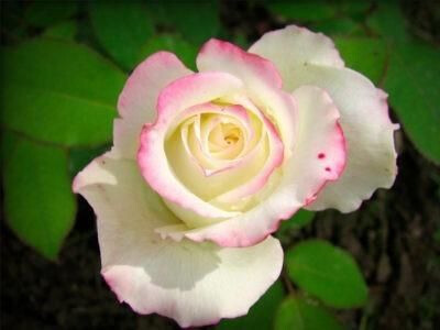 Среди основных преимуществ розы можно выделить ее крупные бутоны диаметром от 10 до 12 см (иногда он достигает 18 см), которые имеют форму конуса. Цветок представлен лепестками различных оттенков – розово-белыми, кремово-белыми с розовыми краями или бело-розовыми. Основная окраска может быть как белой, так и розовой или бело-розовой. Несмотря на бледную насыщенность цвета, двухцветность цветка делает его особенно привлекательным.