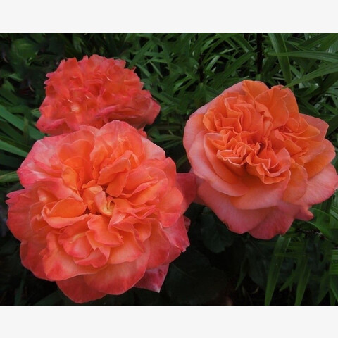 Розы умеренно махровые, насчитывают 17-25 лепестков. Бутоны отличаются овальной формой, верхняя их часть слегка заострённая. У Рене Госсини расцветка яркая, но не пёстрая. Когда розочка лишь начинает раскрываться, бутон окрашен в оранжево-мандариновый тон. По мере созревания цветовая гамма обогащается лососевым, нежно-розовым, алым оттенками. Кустарник испускает сильный фруктовый аромат, в котором узнаются нотки абрикоса, персика, манго, грейпфрута, липового цвета.