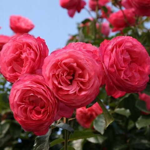 Кустарник имеет мощные стебли, которые покрывают листики насыщенного зеленого цвета. Высокая роза величественно смотрится, хотя цветки не назовешь крупными. Зато они плотные и яркие, не теряются на фоне буйно растущей зелени.