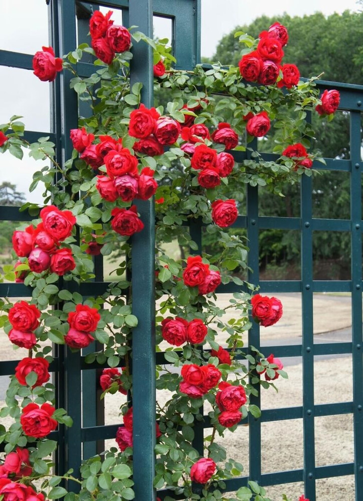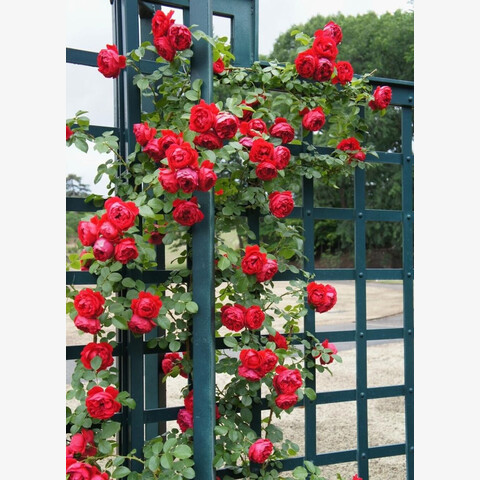 Ярко-красные цветки с желтым глазком, розетковидной формы, густомахровые (26 - 40 лепестков), обладают легким фруктово-цветочным ароматом.