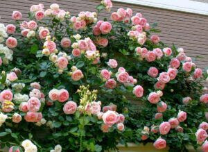 Длинные стебли роз Цезарь густо покрыты великолепными цветами, розовыми в центре и пастельно-кремовыми по краям.