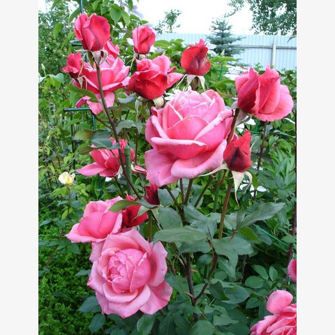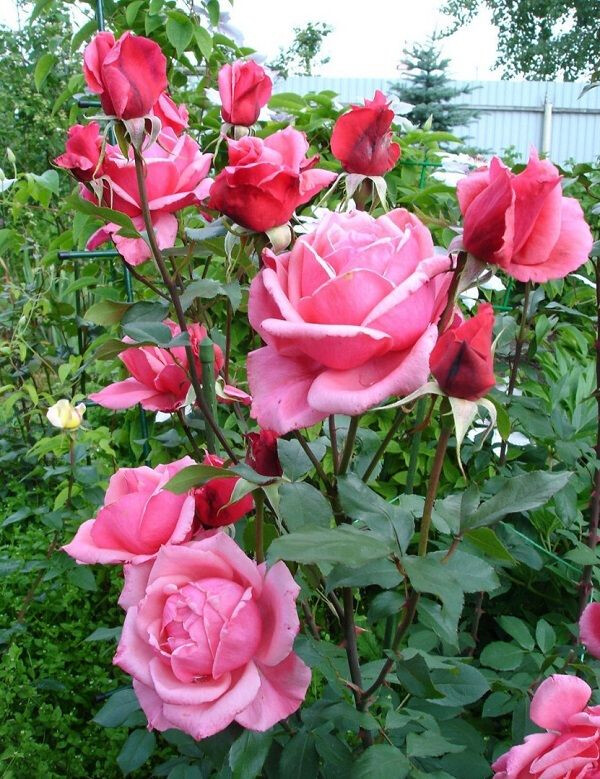 Куст – прямостоячее образование, ветки в основном стремятся уйти вверх. Побеги на кусте достаточно прочные, чтобы заметно не сгибаться под тяжестью созревших бутонов. Отрастает кустовая основа на 1,5 м, в ширину занимаемое ею пространство не выходит за метровый предел. По цвету листья – светло-зелёные, крупных габаритов, с продолговатыми очертаниями. Шипы на розе Эйфелева Башня почти полностью отсутствуют – их настолько мало, что большинство флористов и получателей подарков в виде именно этих роз не воспринимают их наличие всерьёз.