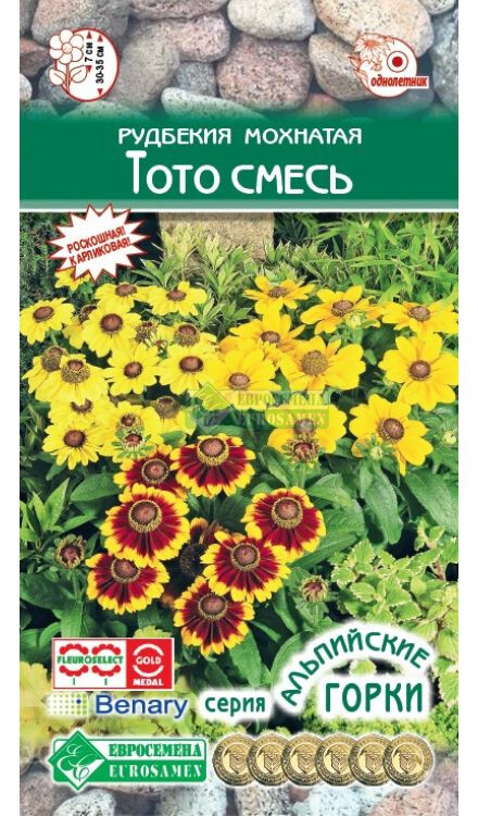 Рудбекия – это красивое декоративно За цвет и форму крупных и объемных соцветий рудбекия получила свое второе, неофициальное имя – золотой шар. С момента появления растения в Европе селекционеры вывели несколько десятков сортов рудбекии, отличающихся друг от друга цветом и формой лепестков. В настоящее время сортовое разнообразие этой культуры достаточно велико. Рудбекия серии Тото - компактное растение с хорошей ветвистостью, характеризующееся ранним и непринужденным цветением. Тото - один из самых эффектных сортов в своем сегменте, это идеальная культура для композиций в контейнерах и горшках. Отлично смотрится при одиночной посадке в вазоны или на комбинированных клумбах. Крупные привлекательные соцветия на компактных, хорошо ветвящихся растениях просто неотразимы. Они всегда уместны в бордюрах, смешанных композициях дикого сада, на передних планах миксбордеров, незаменимы для садов в сельском стиле. Высота растения-30 см Диаметр цветка-7 см