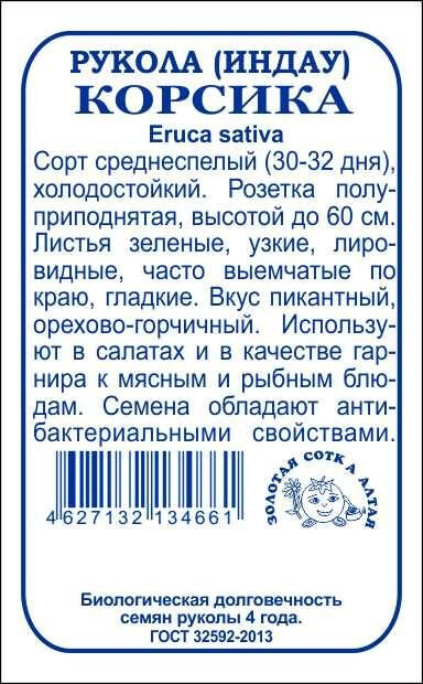 Сорт среднеспелый (30-32 дня), холодостойкий. Розетка полуприподнятая, высотой до 60 см. Листья зеленые, узкие, лировидные, часто выемчатые по краю, гладкие. Вкус пикантный, орехово-горчичный. Используют в салатах и в качестве гарнира к мясным и рыбным блюдам. Семена обладают антибактериальными свойствами.