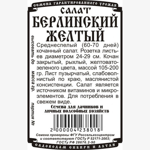 Среднеспелый (60-70 дней) кочанный салат. Розетка листьев диаметром 24-29 см. Кочан закрытый, рыхлый, желтовато-зеленого цвета, массой 105-200г. Лист пузырчатый, слабоволнистый по краю, маслянистой консистенции. Является источником витаминов и микроэлементов. Для потребления в свежем виде.