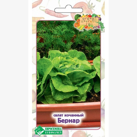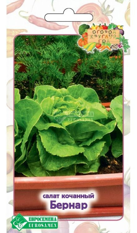 Каждая хозяйка хотела бы иметь свежую зелень в любое время года. Имея дачу или собственный огород можно баловать семью витаминными салатами на протяжении весенне-летнего периода. В зимнее же время нехватка витаминов и питательных веществ чувствуется особенно остро, поэтому все большей популярностью пользуются домашние мини-огороды на подоконниках и лоджиях, где любители земледелия умудряются вырастить почти весь дачный ассортимент овощей. Огород круглый год - модный тренд, занятие приятное и полезное, всегда под рукой пряная зелень к столу — и не нужно задумываться, как сохранить ее в свежем виде. Эта неторопливая работа по уходу за мини-огородом успокаивает, отвлекает от суеты и хлопот, к тому же растения создают особый микроклимат в помещениях, увлажняя сухой воздух и очищая его. Бернар- раннеспелый сорт салата типа Ромен с головками эллиптической формы средней плотности, массой 250 г. Снаружи листья ярко-зеленые, изнутри имеют желтоватый оттенок, хрустящие, сочные. Вкус приятный, сладковатый, устойчивый к растрескиванию.