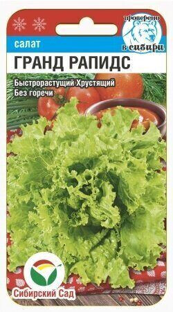 Быстрорастущий Хрустящий Без горечи Среднеранний быстрорастущий сорт красивого полукочанного салата с густогофрированными листьями. От всходов до первой срезки на зелень всего 35-40 дней. Хорошо растет в открытом и защищенном грунте, даже на домашнем подоконнике. Отличается быстрым отрастанием зеленой массы с хрустящей консистенцией и вкусом без горечи. Розетка листьев открытая, округлая, высотой 25 см, диаметром до 22 см, массой до 250 грамм. Листья светло-салатные, плотные, глянцевые, сильно волнистые, хрустящие. Рекомендуются для использования в свежем виде. Растение долго не перерастает, устойчиво к цветушности при посеве в любые сроки. Сорт устойчив к краевому ожогу листьев. Урожайность до 4 кг/м2.