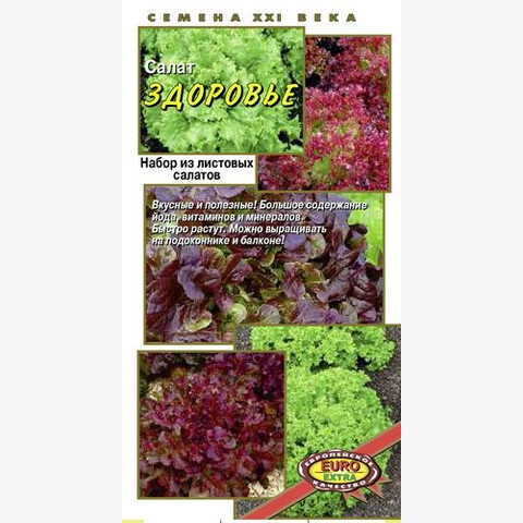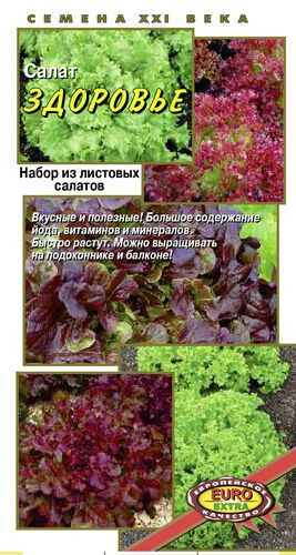 НАБОР ИЗ ЛИСТОВЫХ САЛАТОВ ЗДОРОВЬЕ Раннеспелые урожайные сорта для открытого грунта и для теплиц. Период от массовых всходов до начала хозяйственной годности 35-45 дней. Листья нежные, хрустящие, от светло-зеленого до красновато-розового цветов. В основном устойчивы к цветушности. Можно сеять несколько раз за сезон, а также выращивать на подоконнике и балконе. Рекомендуется для употребления в свежем виде, украшения блюд, а также для декорирования сада. Агротехника: Лучшие предшественники для салата те культуры, под которые вносили органические удобрения. Осенью проводят перекопку с внесением перегноя. Весной вносят минеральные удобрения. Для подкормок рекомендуем комплексное минеральное удобрение «АЭЛИТА- ОВОЩНОЕ». Семена высевают в открытый грунт в начале апреля с междурядьем в 40-50 см. Глубина посева 1-2 см. После посева грунт прикатывают. При появлении плотных всходов производят двукратное прореживание: в фазе 1 настоящего листа на расстоянии 5-7 см и через 1,5 месяца после посева, оставляя между растениями расстояние 15-20 см. После прореживания проводят подкормки. Уход заключается в рыхлении междурядий и поливе. Полив осуществляется по бороздам (избегайте попадания воды на листья растений). Уборку салата осуществляют, срезая листья у самой поверхности почвы. Урожайность до 2,5 кг/кв.м.