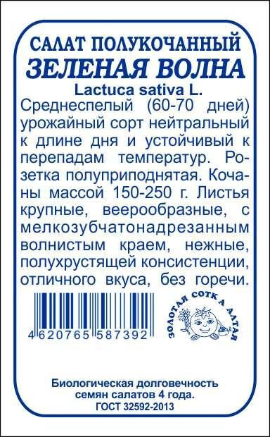 Сорт среднеспелый, нейтральный к длине дня и устойчивый к перепадам температур. Срок созревания60-70 дней. Розетка полуприподнятая, диаметром 31-32 см, высотой 25-27 см. Масса кочана 150-250 г. Лист крупный, веерообразный, с мелкозубчатонадрезанным волнистым краем, нежной полухрустящей консистенции и великолепного вкуса. Сорт рекомендуется для выращивания в открытом грунте и зимне-весенних теплицах.