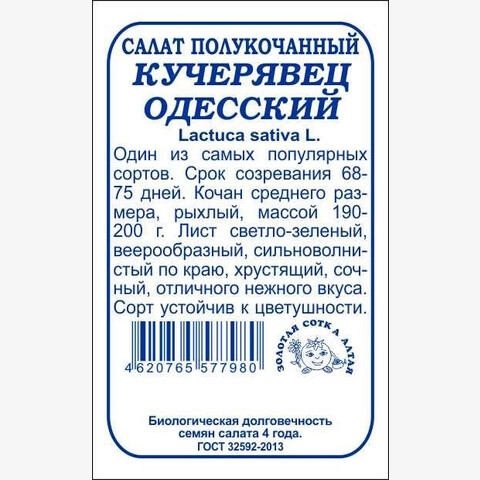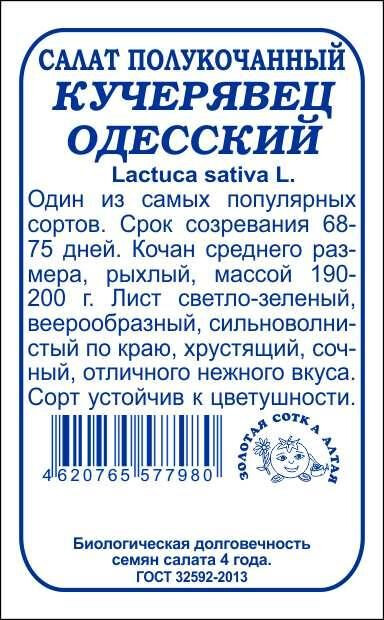Один из самых популярных сортов. От полных всходов до хозяйствен-ной годности 68-75 дней. Розетка листьев полуприподнятая, диаметром 24-32 см. Кочан среднего размера, рыхлый, массой 190-200 г. Лист веерообразный с сильноволнистым краем, светло-зеленый, сочный, хрустящий, превосходного нежного вкуса, без горечи. Сорт устойчив к цветушности, имеет длительный период хозяйственной годности.