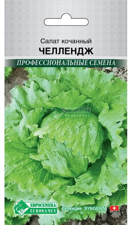 Челлендж — популярный кочанный салат, отличающийся превосходными вкусовыми качествами, крупным и плоскоокруглым, средней плотности, кочаном с массой до 400 и более грамм, имеющий множество положительных отзывов. Относится к сортам со средним сроком созревания: период от всходов до сбора урожая 55-70 дней. Диаметр розетки достигает 30-40 см, лист насыщенного ярко-зеленого цвета, волнистый по краю, поверхность листа пузырчатая. Челлендж обладает устойчивостью к вирусу мозаики салата, ложной мучнистой росе. Растение способно переносить жаркий климат, недостаток влаги. Рекомендуется для выращивания в открытом грунте и пленочных теплицах. Салат содержит в себе практически все группы витаминов и множество минералов, а также органические кислоты. Употребление их в пищу способствует правильному пищеварению, ускоряет и нормализует обмен веществ.