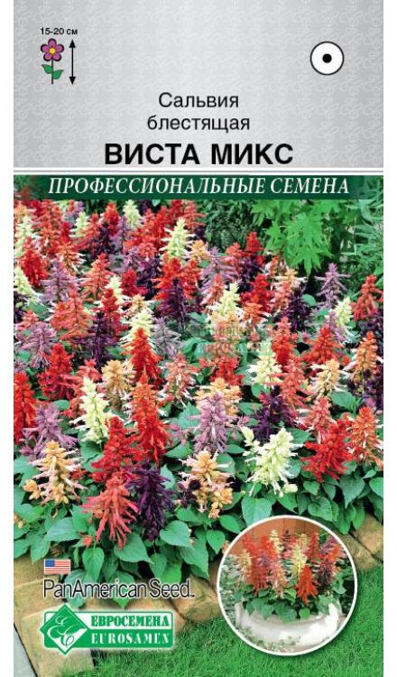 Salvia splendens Vista mix Сальвия блестящая или сверкающая введена в культуру в Европе вначале 19 века, по природе своей -полукустарник, стебли которого в нижней части одревесневают, у себя на родине, в Бразилии, достигает высоты 1 метра. В настоящее время сальвия- традиционный вид садовых однолетних цветов, одно из самых популярных растений в озеленении ковровых посадок, клумб и цветников переднего или среднего плана, очень любимо профессионалами-озеленителями. Серия сальвии VISTA характеризуются ранним и более длительным цветением, компактной формой куста с темно-зелеными листьями и насыщенной, не выгорающей на солнце окраской очень плотных соцветий. Используют для оформления парадных цветников, рабаток, клумб. Идеальное растение для горшечных композиций. Для сохранения декоративного вида на протяжении всего вегетационного периода и образования новых цветоносов необходимо удалять отцветшие соцветия.
