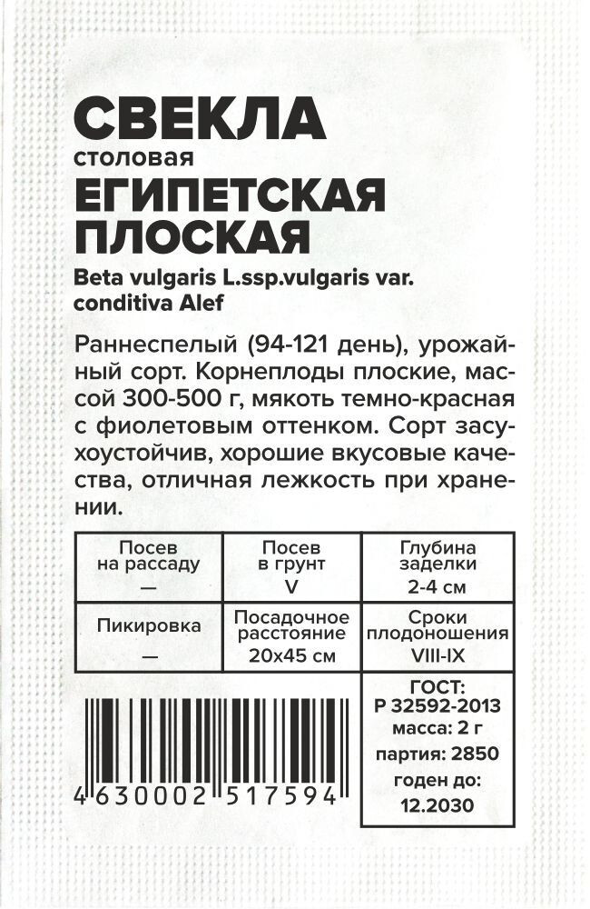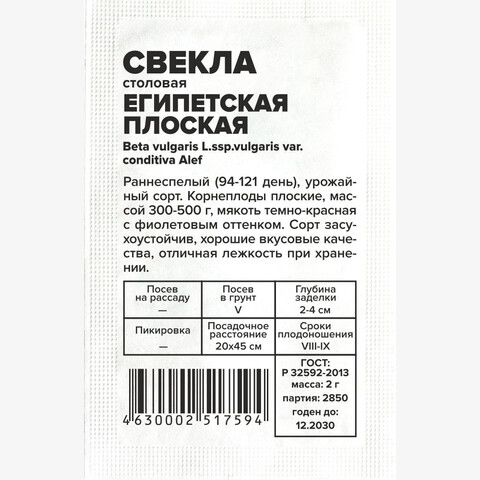 Раннеспелый (94-121 день), урожайный сорт. Корнеплоды плоские, массой 300-500 г, мякоть темно-красная с фиолетовым оттенком. Сорт засухоустойчив, хорошие вкусовые качества Отличная лежкость при хранении. Место посадки: предпочитает плодородные рыхлые нейтральные почвы. Посев проводят после томата, перца, огурцов, гороха, фасоли Освещение: обильное, плохо переносит затенение Предпосевная подготовка: не требуется Сроки посева: после прогревания почвы до 12..15°С (апрель-май) Посев на рассаду: не предусмотрен Посев в грунт: семена высевают на глубину 2-4 см. Для получения крупных корнеплодов схема посадки 20х45 см. Для средних и мелких корнеплодов посев проводят на расстоянии 3-4 см между растениями и не прореживают Пикировка/перевалка: не предусмотрена Уход: требуется регулярный, но умеренный полив. Хорошо отзывается на внесение фосфорных и калийных удобрений, чувствительна к недостатку бора. При закладке на хранение корнеплоды пересыпают увлажненным песком Сбор урожая: проводят до наступления первых осенних заморозков