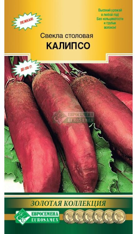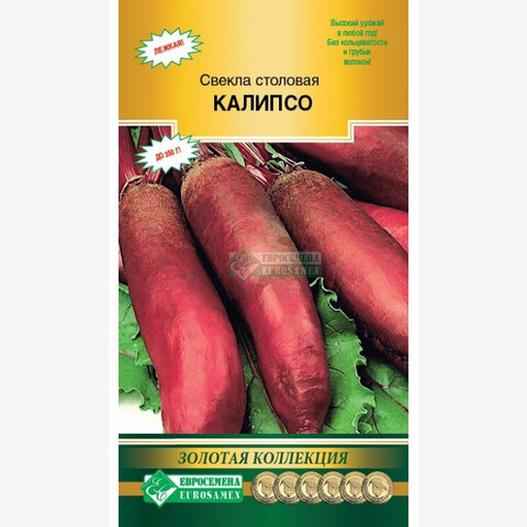Свекла – овощ, который несет огромную питательную ценность для человеческого организма. Из нее можно приготовить множество блюд, самые знаменитые из них – это свекольник и винегрет. Выращиванием овощной культуры занимается практически каждый дачник. Калипсо- среднеспелый, высокоурожайный сорт удлиненно-цилиндрической формы. Сбор урожая проводят через 120-130 дней от всходов. Длина выровненных корнеплодов 20-26 см. Мякоть лилово-красная, без колец. Свекла очень сладкая, сочная, подходит для всех видов кулинарных переработок, в том числе для изготовления соков и заморозки. Масса плодов 250-350 г. Сорт устойчив к цветушности, жаростойкий. Отлично транспортируется и хранится в зимнее время. Урожайность до 10,0 кг/м². Богата витаминами В1, В2, В5, что благотворно влияет на кроветворные функции.