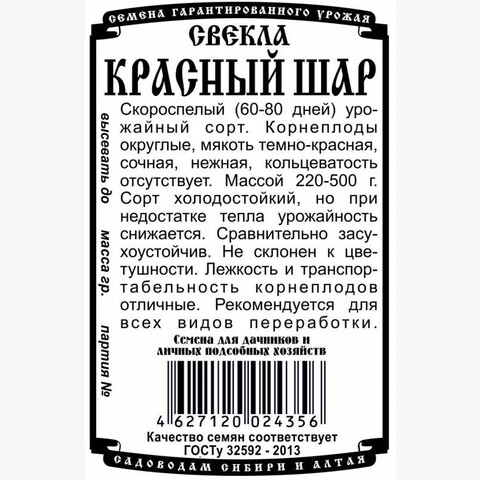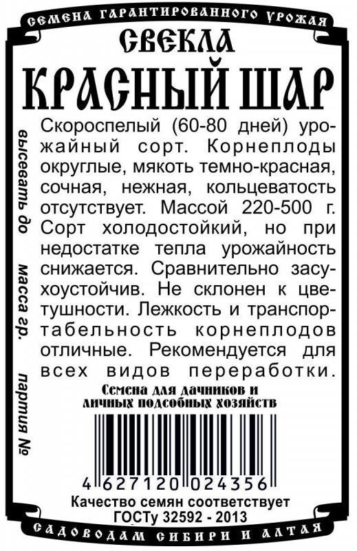 Скороспелый (60-80 дней) урожайный сорт. Корнеплоды округлые, мякоть темно-красная, сочная, нежная, кольцеватость отсутствует. Массой 220-500 г. Сорт холодостойкий, но при недостатке тепла урожайность снижается. Сравнительно засухоустойчив. Не склонен к цветушности. Лежкость и транспортабельность корнеплодов отличная. Рекомендуется для всех видов переработки