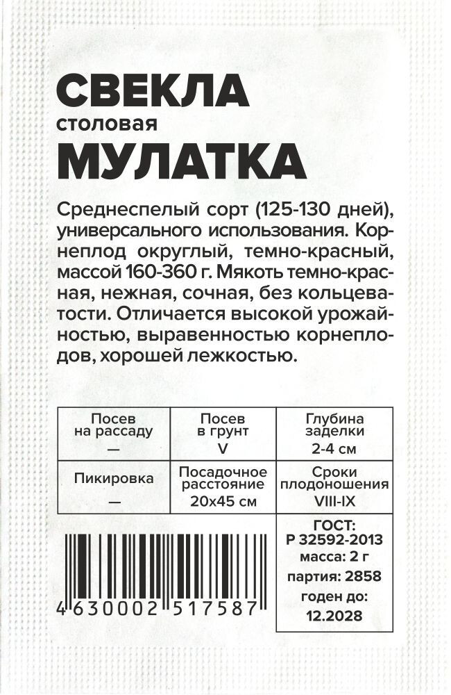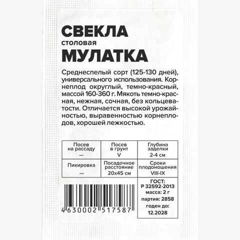 Среднеспелый сорт (125-130 дней), универсального использования. Корнеплод округлый, темно-красный, массой 160-360 г. Мякоть темно-красная, нежная, сочная, без кольцеватости. Отличается высокой урожайностью, выравненностью корнеплодов, хорошей лежкостью. Место посадки: предпочитает плодородные рыхлые нейтральные почвы. Посев проводят после томата, перца, огурцов, гороха, фасоли Освещение: обильное, плохо переносит затенение Предпосевная подготовка: не требуется Сроки посева: после прогревания почвы до 12..15°С (апрель-май) Посев на рассаду: не предусмотрен Посев в грунт: семена высевают на глубину 2-4 см. Для получения крупных корнеплодов схема посадки 20х45 см. Для средних и мелких корнеплодов посев проводят на расстоянии 3-4 см между растениями и не прореживают Пикировка/перевалка: не предусмотрена Уход: требуется регулярный, но умеренный полив. Хорошо отзывается на внесение фосфорных и калийных удобрений, чувствительна к недостатку бора. При закладке на хранение корнеплоды пересыпают увлажненным песком Сбор урожая: проводят до наступления первых осенних заморозков