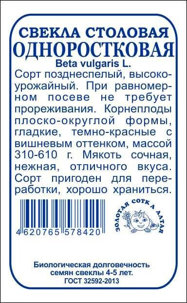 Сорт позднеспелый, высокоурожайный, при равномерном посеве не требует прореживания. Корнеплоды плоско-округлой формы, гладкие, темно-красные с вишневым оттенком, массой 310-610 г. Мякоть сочная и нежная, отличных вкусовых качеств. Сорт пригоден для всех видов переработки, хорошо хранится.