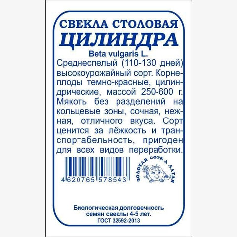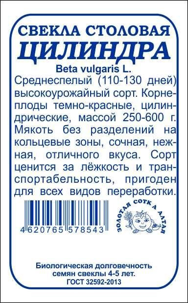 Сорт среднеспелый, транспортабельный, ценится за высокую урожайность и товарность, выравненность корнеплодов и отличные вкусовые качества. Срок созревания 110-130 дней. Корнеплоды темно-красные, цилиндрические, массой 250-600 г. Мякоть сочная, нежная, сладкая, без разделений на кольцевые зоны. Корнеплоды хорошо хранятся, пригодны для всех видов переработки.