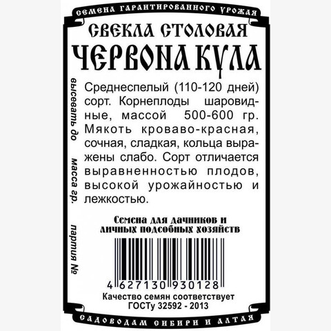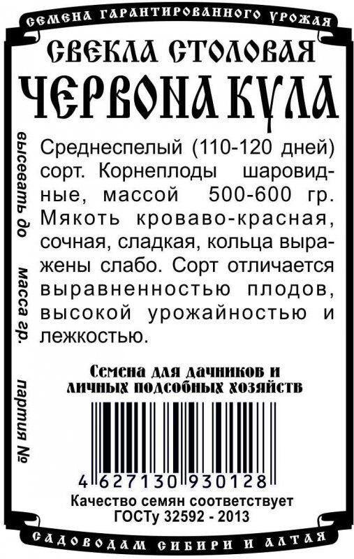 • Среднеспелый (110-120 дней) сорт. Корнеплоды шаровидные, массой 500-600гр. Мякоть кроваво-красная, сочная, сладкая, кольца выражены слабо. Сорт отличается выравненностью плодов, высокой урожайностью и хорошей лежкостью.