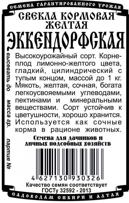 Высокоурожайный сорт. Корнеплод лимонно-желтого цвета, гладкий, цилиндрический с тупым концом, массой до 1 кг. Мякоть, желтая, сочная, богата легкоусвояемыми углеводами, пектинами и минеральными веществами. Сорт устойчив к цветушности, хорошо хранится. Используется как сочные корма в рационе животных.